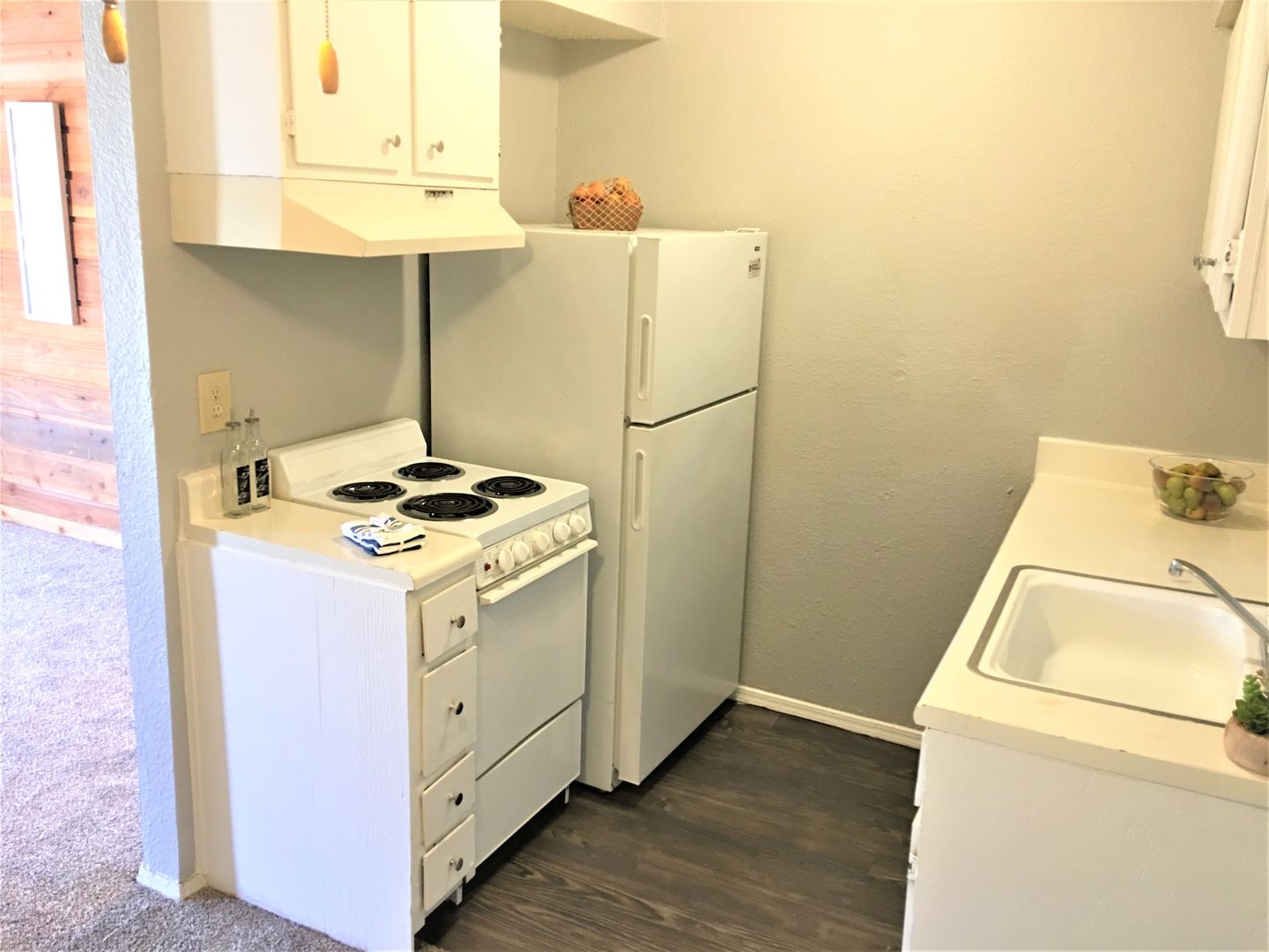 •Elegant vinyl wood flooring in the kitchen, dining, and bathroom