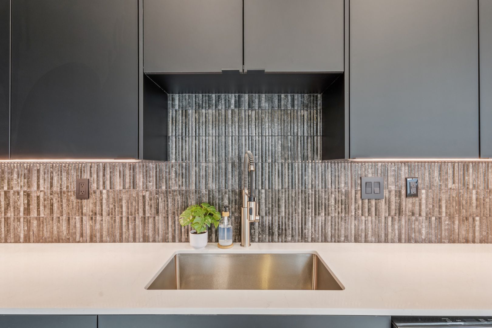 • Quartz countertops with designer backsplash